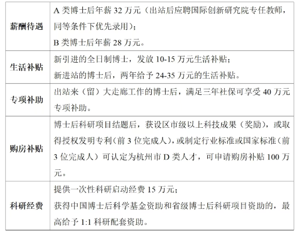 年薪制,入选者可享受具有竞争力的、能够使其安心科研和教学工作的薪酬和福利待遇;杭州市对自主申报成功的国家级、省级、市级海外高层次人才,分别给予最高700万元、400万元、250万元补助。博士后出站来杭,政府提供三年累计最高90万元补贴。新引进的全日制博士,最高发放10万元补贴。