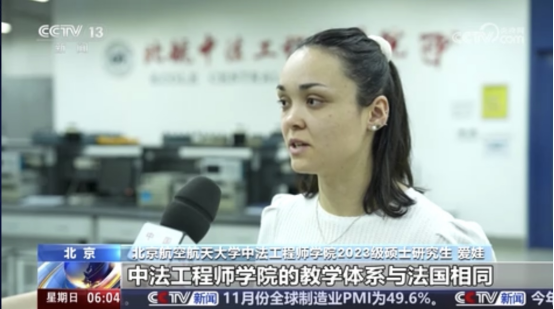 【同期】北京航空航天大学中法工程师学院2023级硕士研究生 爱娃:这里的工程教育非常出色,中法工程师学院的教学体系与法国相同,因为北航与法国学校有合作,有法国教师前来授课,中国教授大多有专业研究方向,我们在这三年的硕士阶段,每年都有课程,同时还需完成3个月和6个月的企业实习,真正实现了全方位培养。