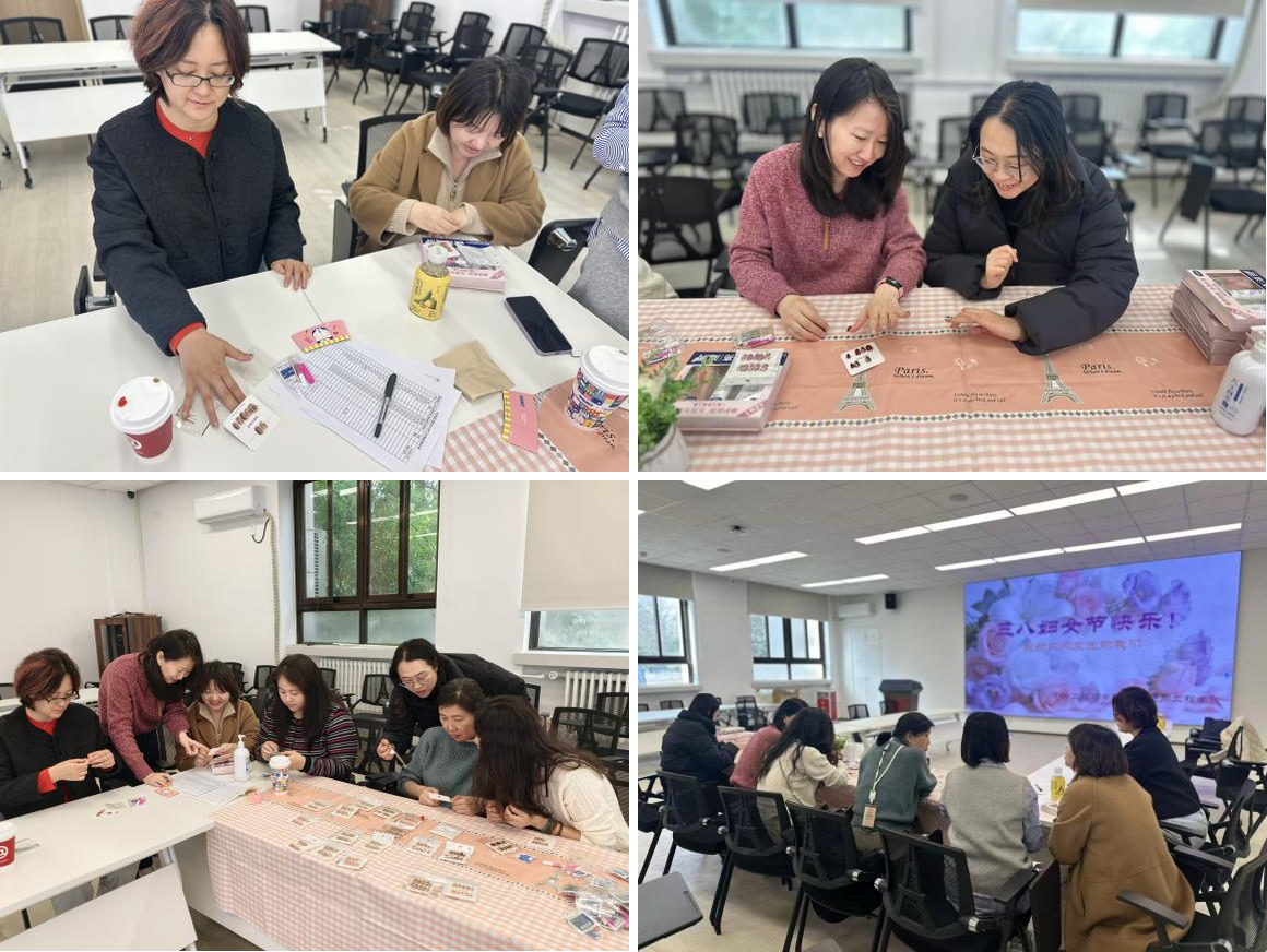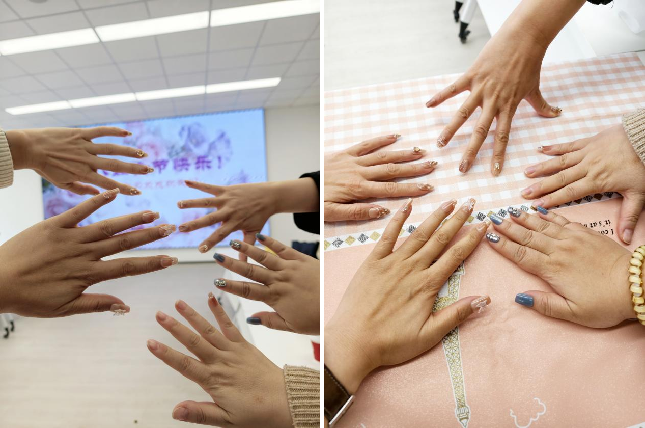 活动现场温馨雅致,欢声笑语不断。学院特别订购了一批穿戴甲,平日里辛勤耕耘在教学、科研与管理一线的女教职工们自己或者互相佩戴精美的穿戴甲。从简约优雅的裸色系,到时尚靓丽的跳色款,再到点缀着精致花卉、闪钻的装饰款,一双双原本朴素的指尖在色彩的装点下瞬间绽放出独特的芳华与魅力。