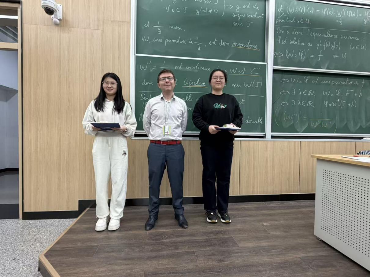 在L2组别(本科至硕士阶段)中,我院学子表现出色:2023级刘圣煜 (Evan) 以满分成绩勇夺该组别半决赛第一名;2024级王若涵 (Estelle) 以优异的成绩位列第三名。本次比赛要求参赛者使用法语作答,这充分展现了中法工程师学院学子扎实的数理基础和出色的法语应用能力。