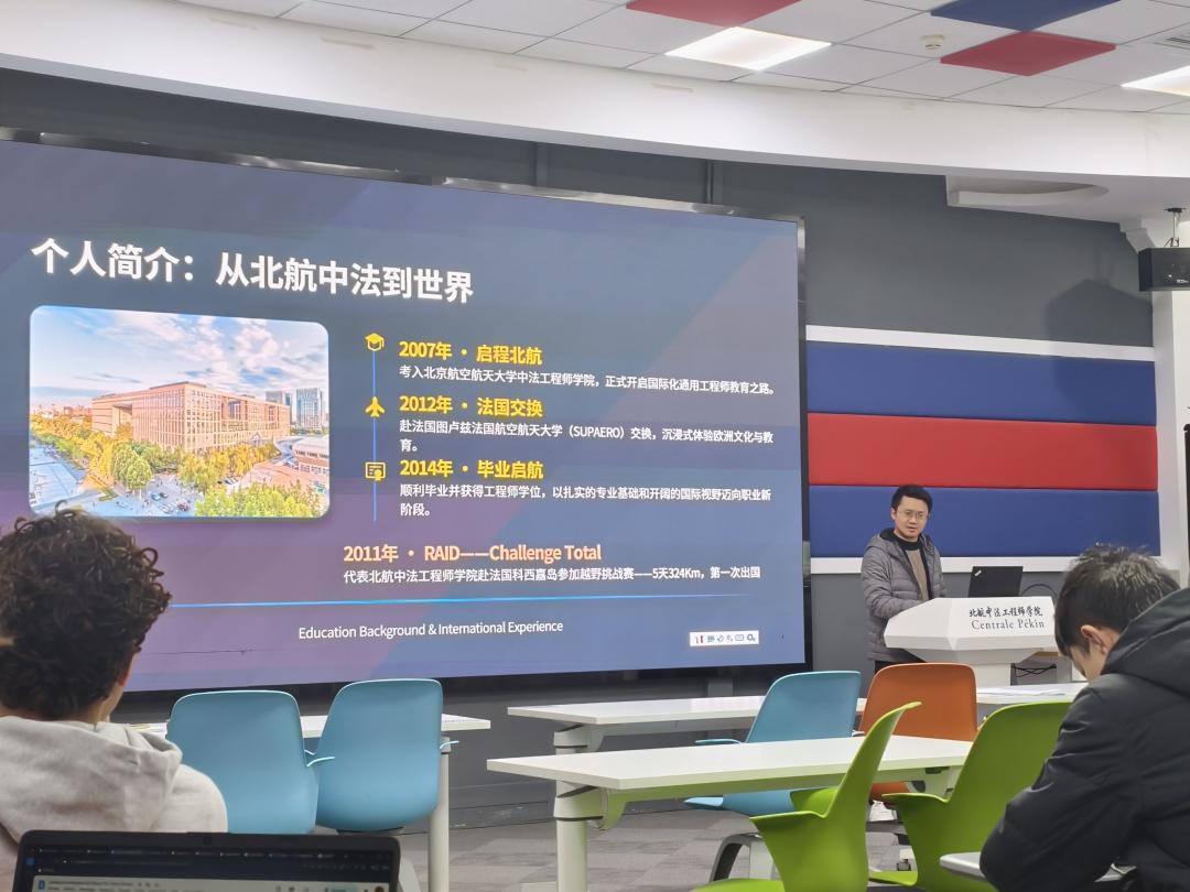 2026年3月20日,北航中法工程师学院2007级校友,致真精密仪器有限公司市场营销总监唐忠杰重返校园,以自身职业发展与跨文化交流经历为切入点,在学院路二号教学楼310教室为在校学子带来了一场生动的分享会。他结合多年海外求学、工作经历,深入解读跨文化交流的价值与意义,为学弟学妹们提供了宝贵的成长指引。学院副院长王韫,法方项目管理团队出席论坛。