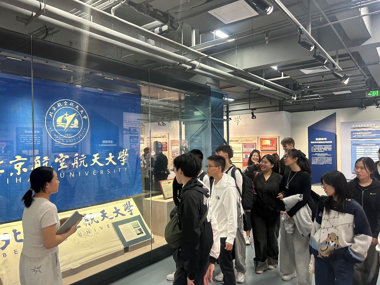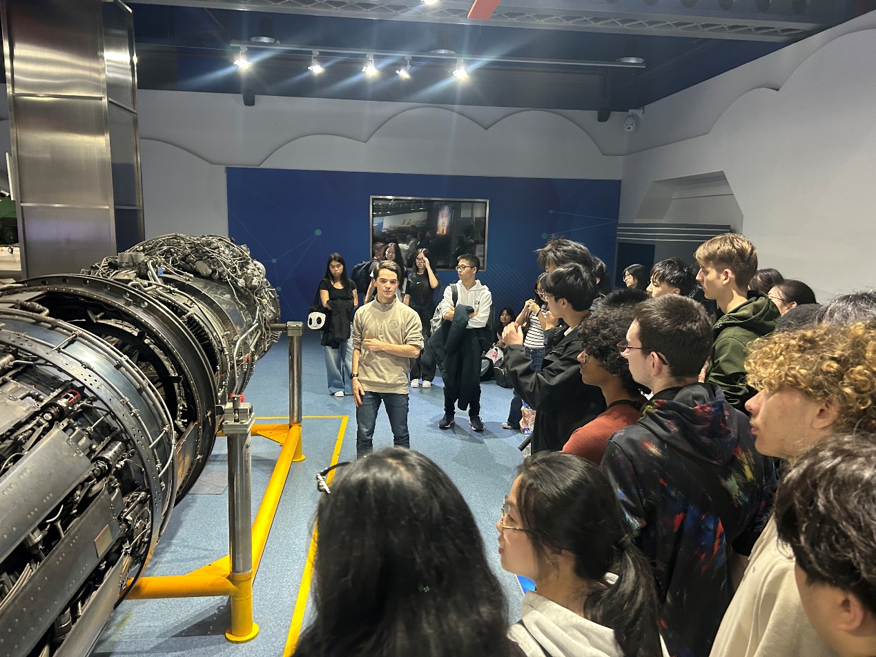 随后,学生团体参观了航空航天博物馆与校史馆。在航空航天博物馆,现场由法国留学生Tristan担任讲解,他为来访高中生详细介绍了“长空逐梦”“银鹰巡空”“空天走廊”“神舟问天”四个展区。通过与真实飞机与发动机等飞机结构的近距离接触,同学们进一步了解了人类航空航天进步历程,也直观感受到了中国航空航天事业的蓬勃发展。